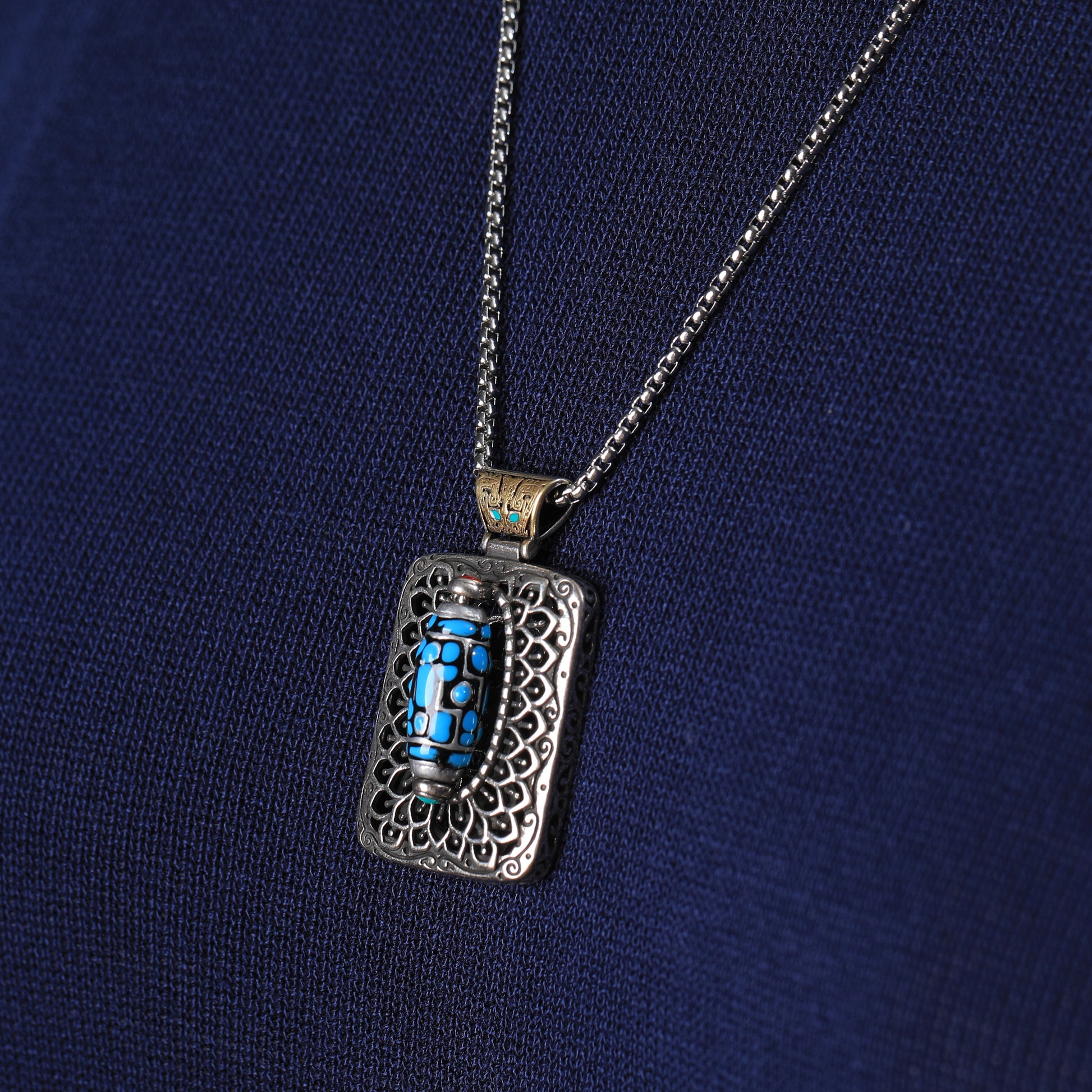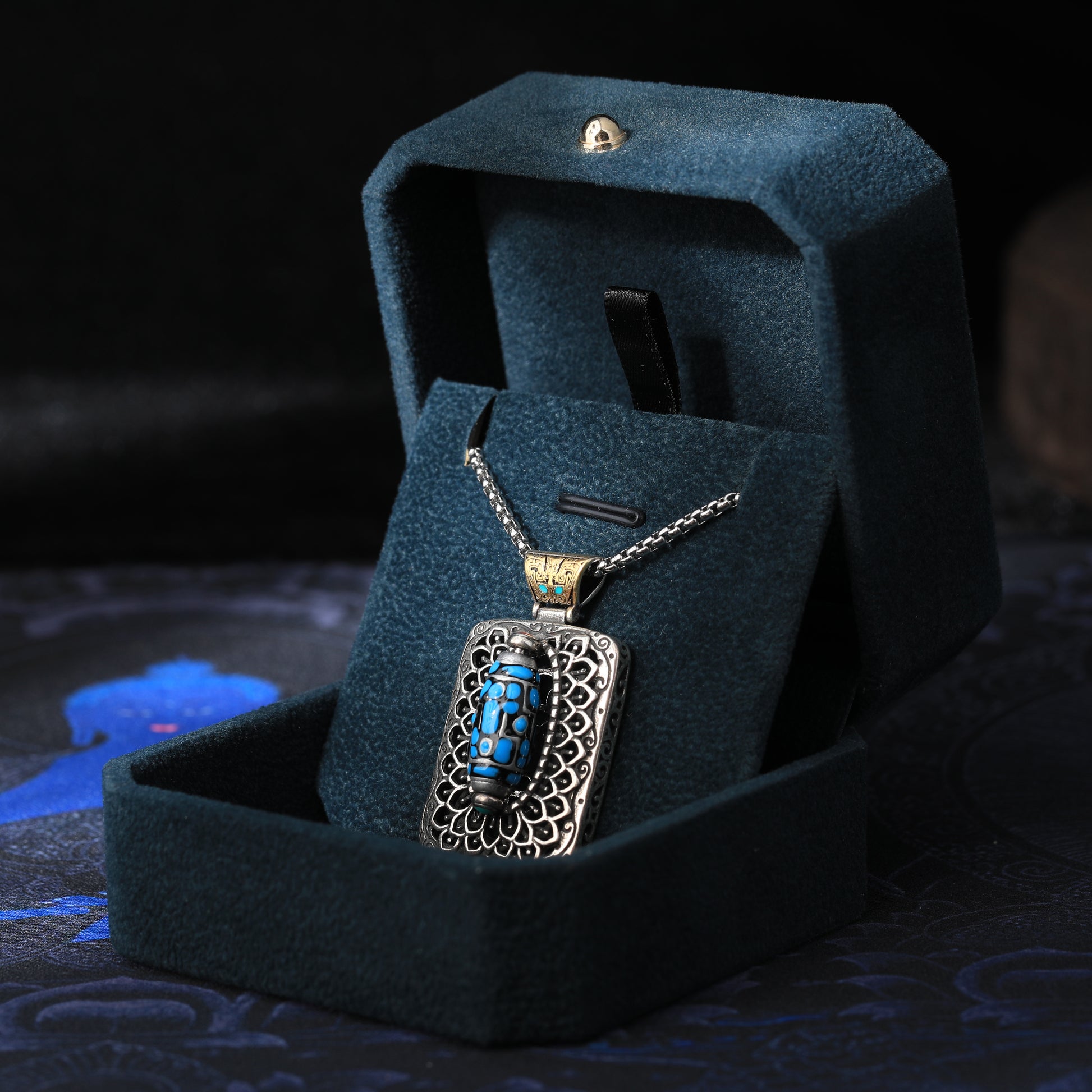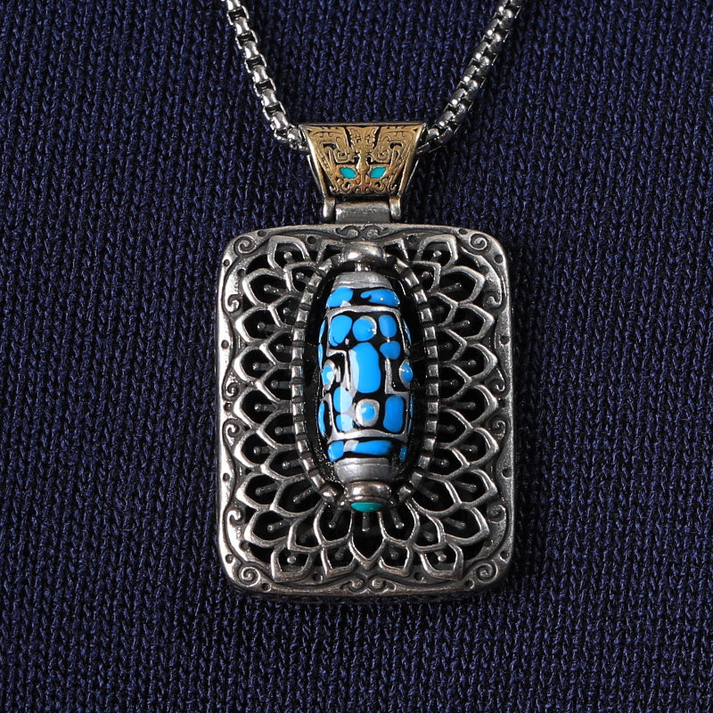 This pendant uses a nine-eye Dzi. Tibetan traders used to walk for months with these things around their necks. They swore the stones kept them safe on mountain trails. The nine-eye pattern is supposed to bring good stuff your way too.